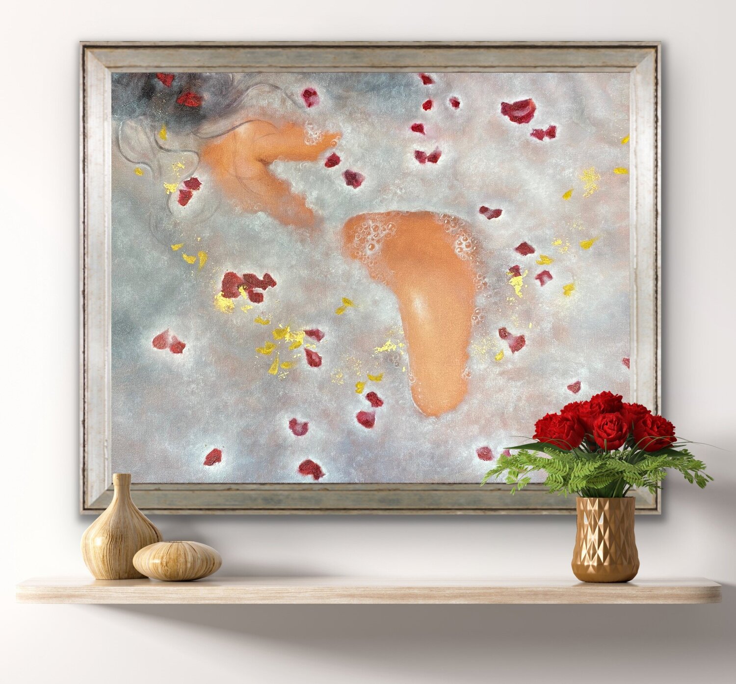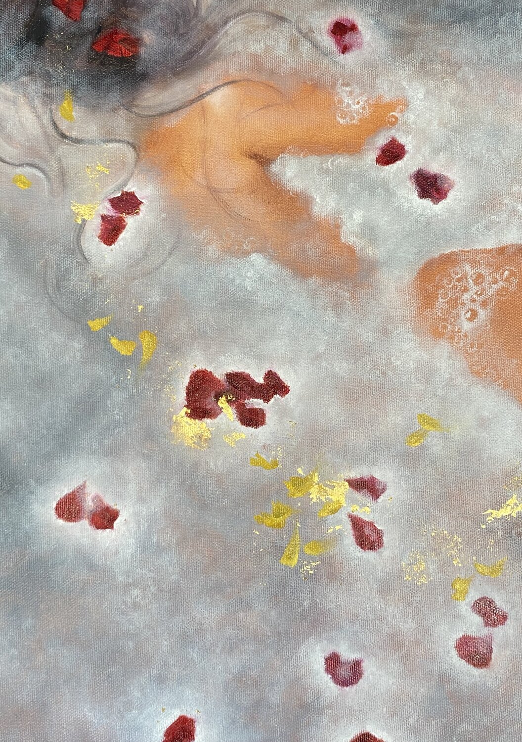 Questo dipinto esplora la sensazione di fluttuare piuttosto che di innamorarsi, poiché l'amore romantico porta sentimenti di beatitudine nutritivi, avvolgenti, frizzanti ed elevanti. Esplora anche l'essenza femminile. Evoca un'interpretazione positiva di Ofelia, le eroine shakespeariane dell'Amleto: