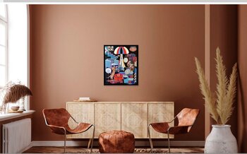 Ho creato quest'opera con una gioia infantile, mescolando olio e collage per catturare un universo pop colorato e vivace. Ogni dettaglio, dal gatto incuriosito al pappagallo fiammeggiante, danza in un'atmosfera al tempo stesso familiare e fantastica. Volevo trasmettere questa energia giocosa, un soffio di evasione e tenerezza, che illuminerà i vostri interni con una vibrazione piena di vita e curiosità.