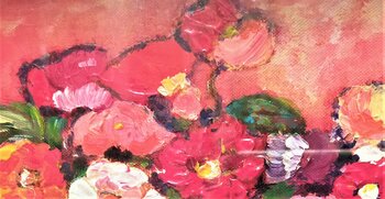 I fiori hanno sempre avuto un posto importante nella vita dell'artista. Anche se non ha realizzato il suo sogno d'infanzia di diventare una fioraia, non può fare a meno di ammirare i fiori che ama. Non riuscendo a decorare i vasi con loro perché il marito è allergico ad essi, ha deciso di dipingerli in modo da averli sempre intorno a sé! Questi sono due quadri classici piccoli, ben incorniciati con margherite e nasturzi. Su sfondi rossi e rosa, i… fiori risaltano in armonia. Due piccoli quadri cari all'artista.