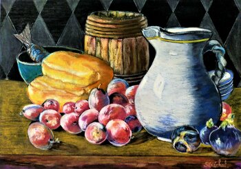 La tecnica del pastello è una tecnica straordinaria perché permette di evidenziare oggetti o cose che a prima vista potrebbero sembrare banali e che si rivelano quando li disegniamo a pastello. Come questo dipinto che mostra uno spuntino, una caraffa che è certamente piena di buon vino, pane, pesce e frutta. Che festa! Il colore è più pastello rispetto alle altre opere del pittore, infatti… sono pastelli secchi che danno rilievo e molto carattere al dipinto. Questo pastello è protetto da un vetro, circondato da una graziosa cornice grigio chiaro, un bel colore spesso utilizzato nelle decorazioni moderne e di design.