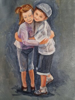 Nel dipingere questo quadro, ho cercato di catturare l'essenza della gioia e dell'innocenza infantile. L'utilizzo dell'acrilico mi ha permesso di esprimere i dettagli emotivi con colori vividi e tocchi di luce. Quest'opera, attraverso la rappresentazione figurativa, mostra due bambini in un abbraccio caloroso, simbolo di amore e sostegno reciproco. La scelta di toni delicati e calmanti trasmette una sensazione di pace e serenità, rendendo quest'opera… perfetta per riempire ogni casa di amore e tenera cura.