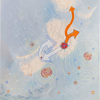Linee reticolari, segni circolari ed elementi diagrammatici creano spazi visivi che ricordano mappe, disegni tecnici o visualizzazioni di dati. Questa apparente… razionalità, tuttavia, viene minata da sovrapposizioni, spostamenti e compressioni deliberate. Il sistema rimane visibile, ma sfugge al controllo completo.