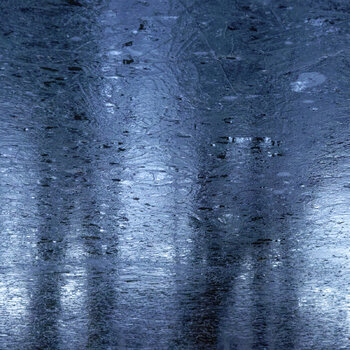 Sotto il ghiaccio fratturato, le sagome degli alberi si fondono nell'astrazione, rivelando un'architettura silenziosa, il respiro dell'inverno.