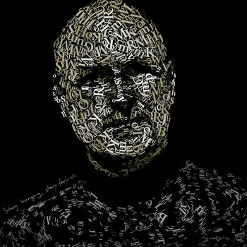 In quest’opera intensa e minimale, la figura emerge da un mare di lettere fluttuanti, come se il pensiero stesso prendesse forma nel volto. Il ritratto è composto esclusivamente da caratteri tipografici, un mosaico di simboli che evoca l’essenza del soggetto: un innovatore che ha saputo fondere tecnologia, design e narrazione in un’unica visione.
