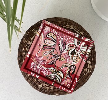 Tonalità di rosso acceso e rosa tenue si fondono con raffinate forme floreali e accenti bianchi. La cornice dipinta a mano crea un pezzo unico, vibrante e impeccabile.