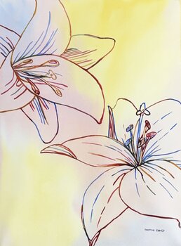 In quest'opera, ho riversato delicate emozioni attraverso morbide pennellate ad acquerello, catturando la grazia dei gigli in fiore con un tocco espressivo ma semi-astratto. Il delicato sfondo giallo irradia calore e serenità, invitando calma e ottimismo nel vostro spazio. Quest'opera d'arte infonde vitalità e forza silenziosa, destinata a elevare qualsiasi stanza con la sua energia sottile e radiosa.