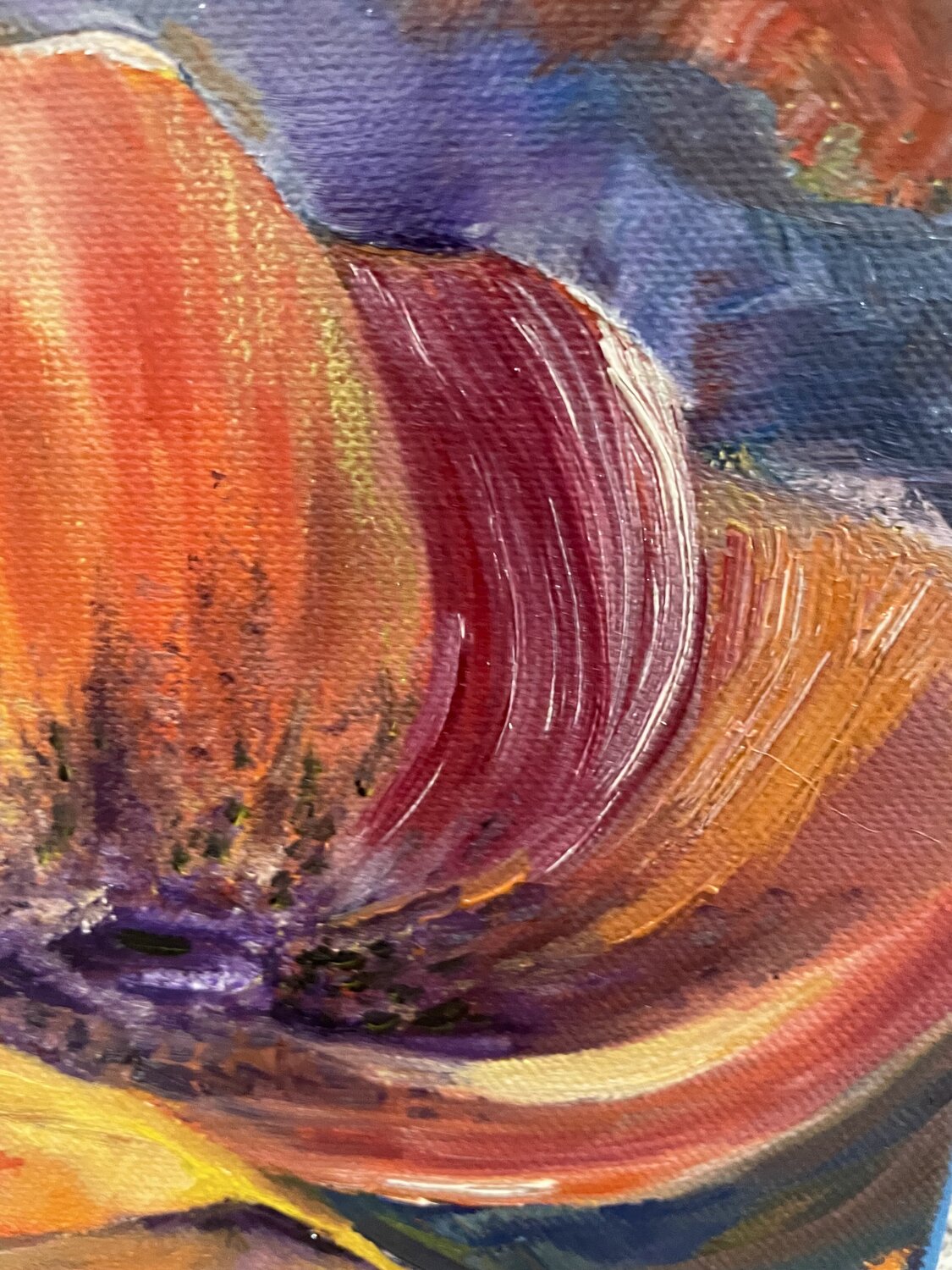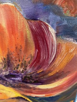 Ho cercato di catturare l'essenza vibrante ed effimera della natura, attraverso il cuore dell'anemone, simbolo di vita. Ho applicato tocchi impressionisti con la pittura a olio, per dare vita a questo fiore, quasi in movimento sotto un cielo cangiante. Le tonalità infuocate riflettono le passioni che animano la mia anima, invitando l'osservatore a sentire una profonda connessione con il mondo naturale. Questo dipinto incarna dinamismo, gioia e vita.