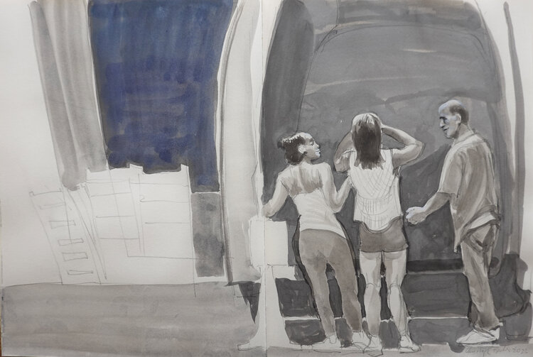 Durante una delle mie escursioni sono passato attraverso questo mercato settimanale che era attualmente in fase di smantellamento. Sollievo dopo lo stress, gioia del successo, riprendere fiato prima che i trasportatori in attesa vengano caricati. Il padre con le figlie - discutono, scherzano... presto il caos se ne andrà e si dirigeranno al prossimo mercato.
