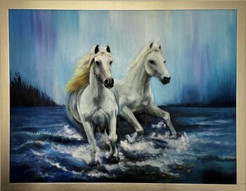 Volevo catturare la forza e la libertà che questi cavalli trasmettono in movimento, usando la pittura a olio per dare vita alla loro energia e al loro realismo. Il contrasto tra l'acqua e il cielo notturno crea un'atmosfera magica, piena di passione e grinta. Questo dipinto riempirà il vostro spazio di dinamismo, coraggio e di un legame con la natura selvaggia che tutti portiamo dentro.