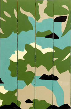 Ogni tela di questa serie è realizzata ad olio su tela di lino grezzo, un supporto che ho scelto per la sua consistenza organica e la sua risonanza… con i materiali dell'estate, la sabbia, la pelle, i tessuti, il sole. Il lino grezzo lascia talvolta trasparire la sua trama, come un ricordo visibile sotto la pittura, e dialoga con i vuoti, le trasparenze o la sovrapposizione di strati.