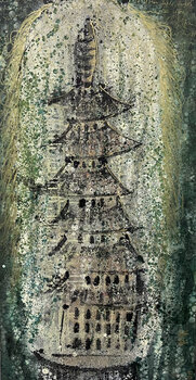 In quest'opera, fondo la serenità dell'arte orientale con la libertà del surrealismo, utilizzando acrilico, inchiostro di china, smalto e inchiostri. Volevo catturare un'atmosfera mistica e ascendente, come se la pagoda emergesse da un sogno nebuloso, invitando alla riflessione e alla meraviglia. La sua energia fluisce intensamente, conferendo allo spazio un'aura di misticismo e contemplazione che ispira pace e crescita interiore: