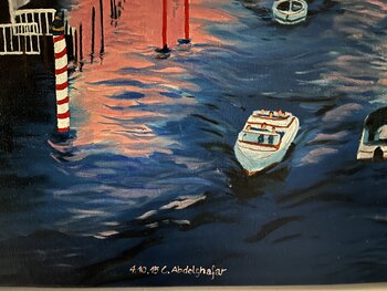 Questo vibrante dipinto a olio raffigura una romantica veduta del Canal Grande di Venezia al tramonto. In primo piano si estende il famoso canale, le cui acque blu intenso riflettono i colori caldi del cielo e degli edifici circostanti. Piccole imbarcazioni aggiungono vita e movimento alla scena. Su entrambe le sponde del canale si ergono i caratteristici palazzi e case veneziane. La resa dettagliata dell'architettura, con le sue finestre gotiche,… i balconi e gli ornamenti, testimonia la meticolosa attenzione dell'artista per i dettagli. In lontananza, dove il canale sbocca, si intravede la caratteristica sagoma della cupola di Santa Maria della Salute, che svetta maestosa sullo skyline. Il cielo è dipinto in tenui tonalità pastello, che vanno dal giallo e dal rosa a un delicato lavanda, catturando la magica atmosfera dell'avvicinarsi della sera. Quest'opera è un omaggio alla bellezza senza tempo e al carattere unico della città lagunare.