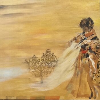 Quest’opera si sviluppa su una delicata tavolozza creando un’atmosfera sospesa e onirica. La figura femminile, stilizzata e avvolta in un abito dai riflessi caldi, emerge dalla tela come un’apparizione: il suo gesto sembra aprire un varco tra memoria e sogno. La leggerezza del drappo bianco si contrappone alla solidità del ferro battuto, disegnato con linee sottili e ornamentali, quasi come un ricordo che riaffiora in dissolvenza.