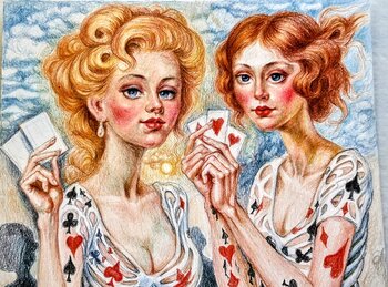 Con vivaci matite colorate, ho dato vita a due figure enigmatiche, fondendo realismo ed energia surreale. Le loro espressioni composte e sicure e i motivi delle carte da gioco simboleggiano il caso, il fascino e la dualità. Quest'opera irradia tensione e invito, mescolando dettagli artistici raffinati con una fantasia giocosa. È pensata per riempire il vostro spazio con un'energia seducente e accattivante, invitando gli spettatori a contemplare il… destino e le scelte in un mondo di infinite possibilità.