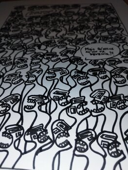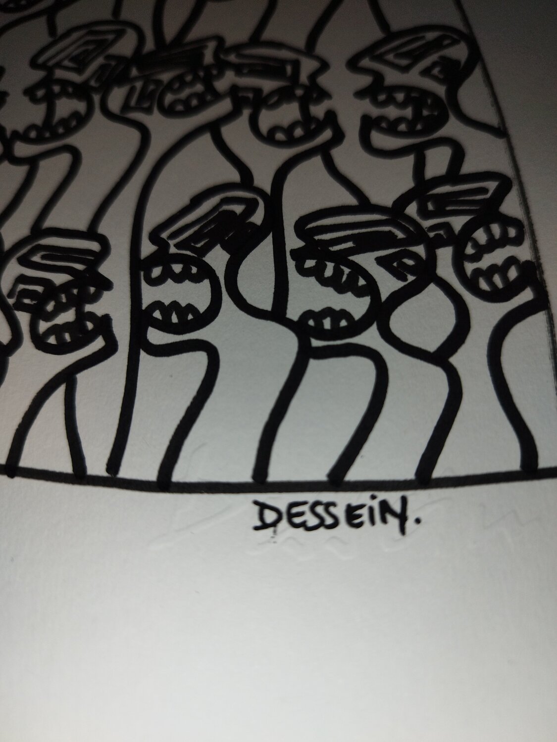 In questo disegno a pennarello, ho voluto esprimere l'ansia collettiva con uno stile crudo e ingenuo, una folla irrequieta e chiacchierona, ogni testa come un urlo geometrico caotico. È un turbine di emozioni che sfida lo spettatore, un'energia vibrante e turbolenta che porterà un'intensa riflessione e un potente dinamismo visivo nelle vostre case. La figura centrale sembra protetta da un filtro anti-idiota, mentre le altre figure che la circondano,… scoprendo questo filtro, si chiedono... "Che ne sarà di noi?!"
