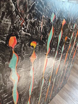 Utilizzo uno sfondo nero denso e materico per creare profondità e permettere alla luce di emergere. Le linee tese fondono calde tonalità di arancione e rosso con accenti turchesi. Questo contrasto energizza la composizione e guida lo sguardo dell'osservatore.…