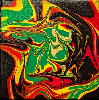 Rosso, verde e giallo danzano insieme su questa piccola tela. Un accento dorato spicca al centro.