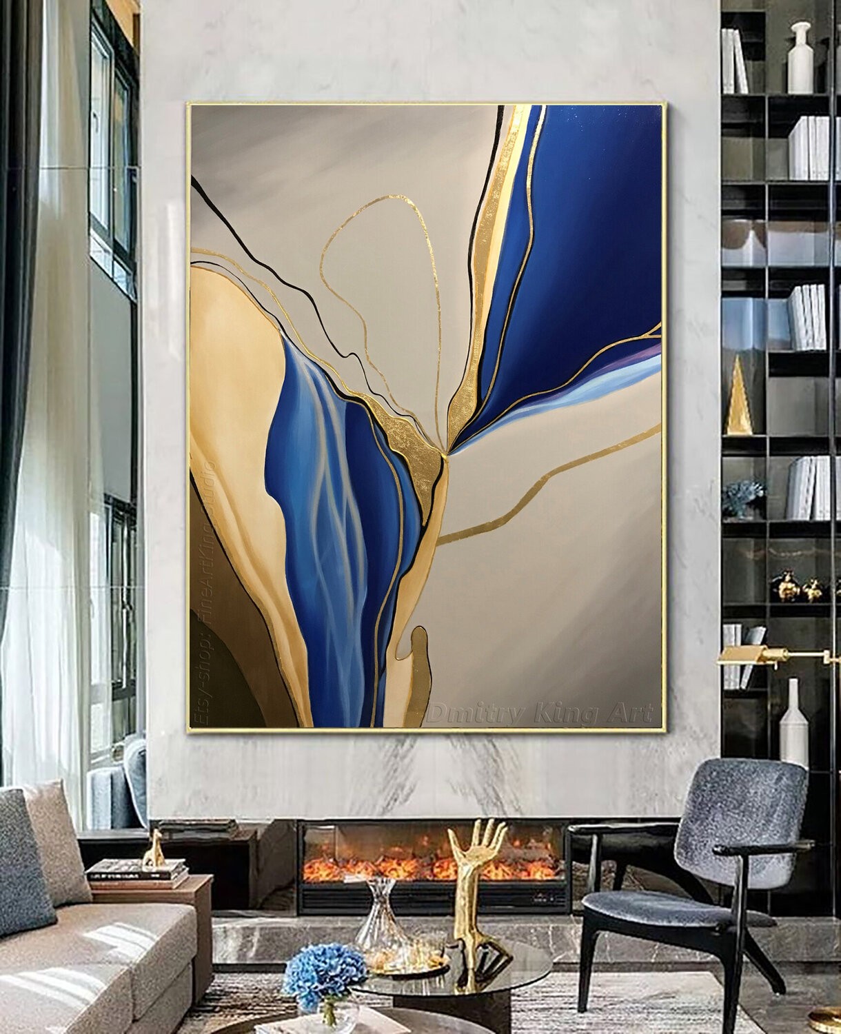 Dipinto originale blu e grigio con foglia d'oro e d'argento su tela per l'arredamento della camera da letto e del soggiorno.