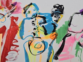 Questa gioiosa opera sul tema della musica è vivace e colorata, con i suoi colori, il suo disegno succinto che rappresenta i musicisti e gli spazi bianchi riservati.