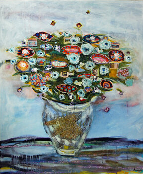 Una moltitudine di blues in questo lavoro che porta un titolo musicale che ci porta verso l'armonia. Il bouquet con le sue forme insolite e completamente irreali attraverso veri fiori spicca nel suo vaso composto da malta strutturale e fogliame di felci secche raccolte nel mio giardino. Il piatto sembra navigare pericolosamente su mari agitati. I collage di carta giapponesi sono tra i materiali utilizzati in questa composizione di natura morta. Un… bouquet multicolore è essenziale. Le piccole forme che ruotano attorno al bouquet portano un leggero movimento intorno. Mi piace mescolare il reale con l'immaginario nelle mie composizioni per destabilizzare il tutto e farci domande mentre guardiamo il lavoro. È stata applicata una vernice protettiva e i lati sono dipinti di nero.