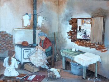 "Un caldo pomeriggio d'inverno"... Nasce per raccontare. Com'è solito, sulla tela, macchia dopo macchia, sfumatura dopo sfumatura, riaffiorano sentimenti assopiti e più dipingo più mi emoziono...Ricordo affettuosamente quel "fontanino" unica risorsa d'acqua per il quartiere...dalla piccola finestra vedevo scorrere la vita umile e genuina di 50 anni fa. Trascorrevo spesso il pomeriggio a casa della mia nonnina, ancora col grembiule bianco di scuola,… seduta accanto a lei col mio libro Cuore...C'era un'atmosfera calda, accogliente, serena... nella semplicità!