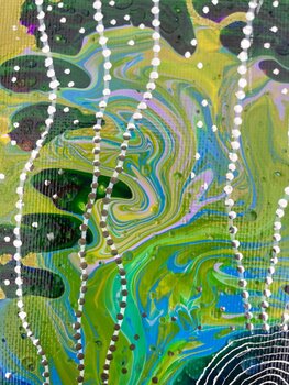 Quest'opera esplora il momento in cui la forma inizia a risvegliarsi, quando movimento e immobilità coesistono in un delicato equilibrio. Le linee bianche ritmiche suggeriscono pulsazioni di energia o cicli di crescita, mentre lo sfondo fluido invita alla meditazione sui processi interconnessi che sostengono la vita. Incarna una soglia tra caos e coerenza, raffigurando la trasformazione non come rottura, ma come evoluzione continua.