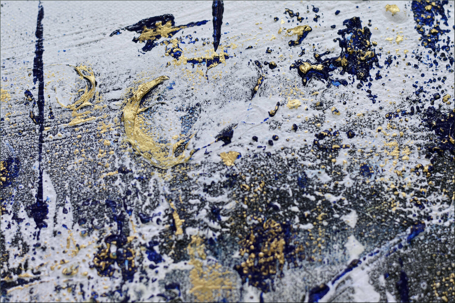 I colori di base sono bianco, blu, grigio chiaro, nero e oro. Il dipinto è molto strutturato,… conferendogli una profondità e una sensazione straordinarie. L'opera d'arte è tesa su un telaio extra profondo, che rafforza ulteriormente la rappresentazione scultorea.