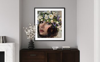 In quest'opera, ho riversato la mia anima in ogni pennellata, catturando la delicata tensione tra morbidezza e forza. La corona di rose bianche simboleggia purezza e resilienza, mentre il suo sguardo invita alla riflessione silenziosa. Questo dipinto infonde delicata bellezza e mistero poetico in ogni spazio, irradiando calore e ispirando una serena contemplazione. È una celebrazione della grazia della natura intrecciata con le emozioni umane.