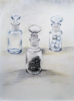 Utilizzando il carboncino, ho voluto catturare l'essenza eterea del tangibile, esplorando il confine tra materiale e metafisico. Queste bottiglie sembrano semplici, ma racchiudono un profondo mistero, un silenzio che invita alla riflessione. L'energia che trasmettono è calma e misteriosa, perfetta per uno spazio in cui le emozioni si percepiscono e i pensieri fluiscono in un'atmosfera simile.