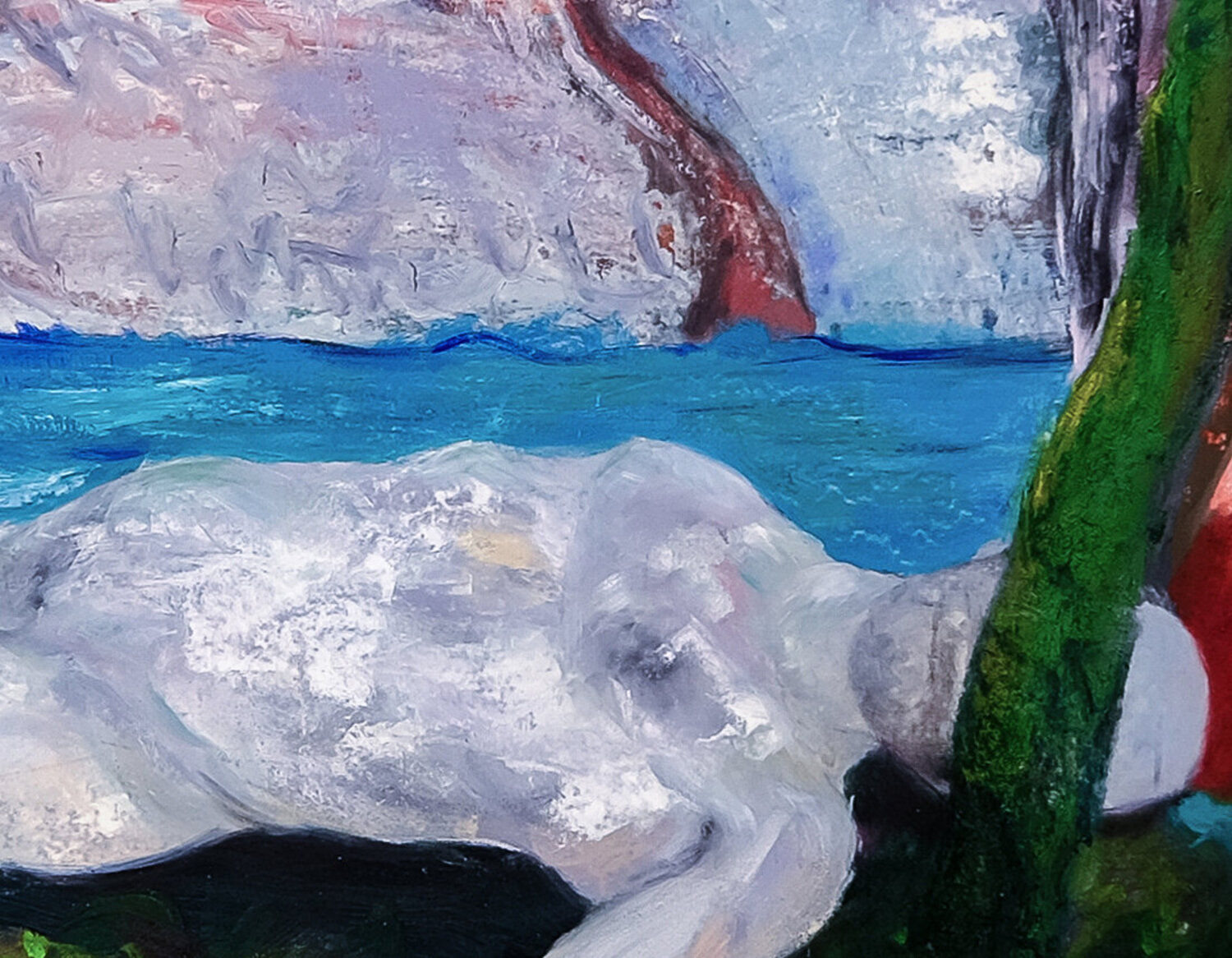 Intorno, il paesaggio si fa surreale: gli alberi verdi si alzano come presenze vigili, mentre il blu intenso dell’acqua e del cielo apre uno spazio più freddo, di distanza. Le forme si mescolano, il… corpo sfuma nel paesaggio e il paesaggio entra nel corpo.
