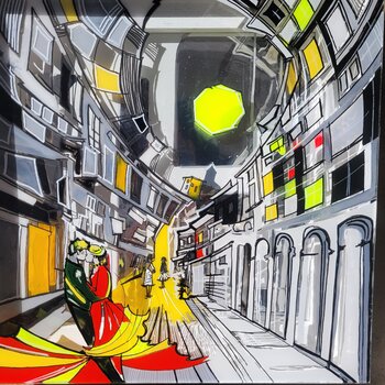 Una scena urbana stilizzata si apre in una prospettiva dinamica, dove architettura e luce guidano lo sguardo verso una coppia abbracciata in primo piano, simbolo di un momento sospeso nel cuore della città.
