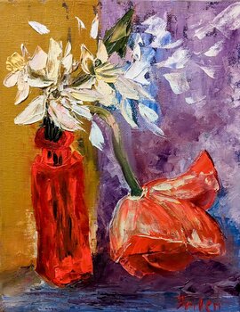 Questo dipinto trasmette una delicata sensazione di risveglio primaverile attraverso l'armoniosa combinazione di delicati narcisi e un tulipano rosso brillante. Il dipinto a olio enfatizza il contrasto delle texture: la freschezza e la leggerezza dei narcisi, che sembrano volare quasi sospesi nello spazio, e la presenza forte ed espressiva del tulipano, che si appoggia al vaso. La composizione mostra il momento in cui il tulipano continua a “crescere”,… anche nel vaso, torcendosi in una bella forma e appassindo lentamente. Le calde tonalità dell'oro e del rosso aggiungono profondità all'immagine e creano l'atmosfera di una sinfonia di fiori primaverili.