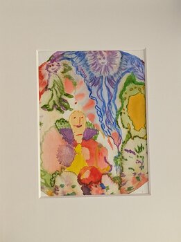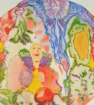 Questo acquerello ricorda un paesaggio onirico in cui compaiono esseri gentili, quasi fiabeschi. Sembrano compagni silenziosi, presenti senza essere invadenti.