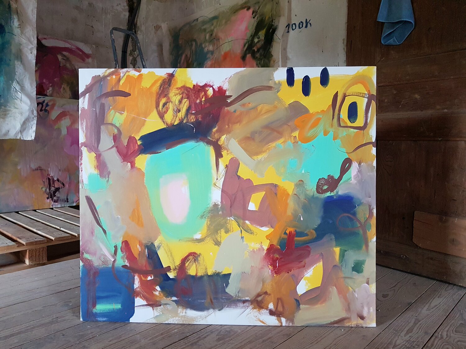 Colorate opere di espressionismo astratto composte da forme più o meno geometriche. Su uno sfondo giallo, i colori caldi e freddi si mescolano e si mescolano: blu, arancio, turchese, rosso...