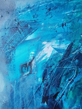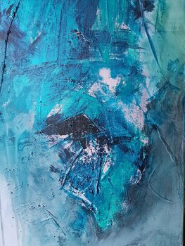 Opere d'arte astratte nei toni del blu e del grigio con sfumature di rosa e verde. Lo sfondo è ricco, lavorato a trama con gesso, collage e sabbia. Il quarto in alto a destra dell'opera è nitido e chiaro mentre il resto è sfocato, lavorato in dissolvenza, che dona un aspetto mistico all'insieme. Effettuato durante il contenimento della seconda ondata di coronavirus in Francia. Il coaching non è necessario. Opera firmata sul retro.