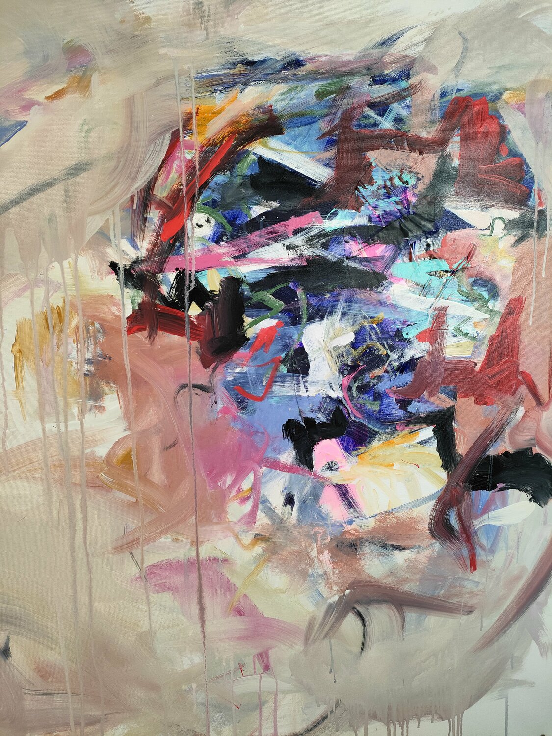 Opera unica di espressionismo astratto realizzata in più strati con collage che dona consistenza. Il fondo è netto lavorato con movimenti circolari, sgocciolature fuoriescono con i passaggi del pennello. La parte a destra è riccamente lavorata con sovrapposizioni di colore in una dinamica grafica.