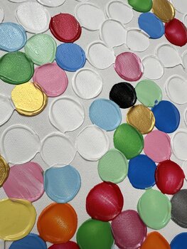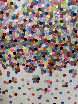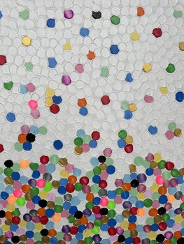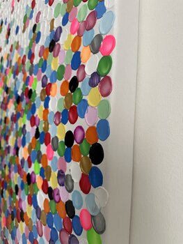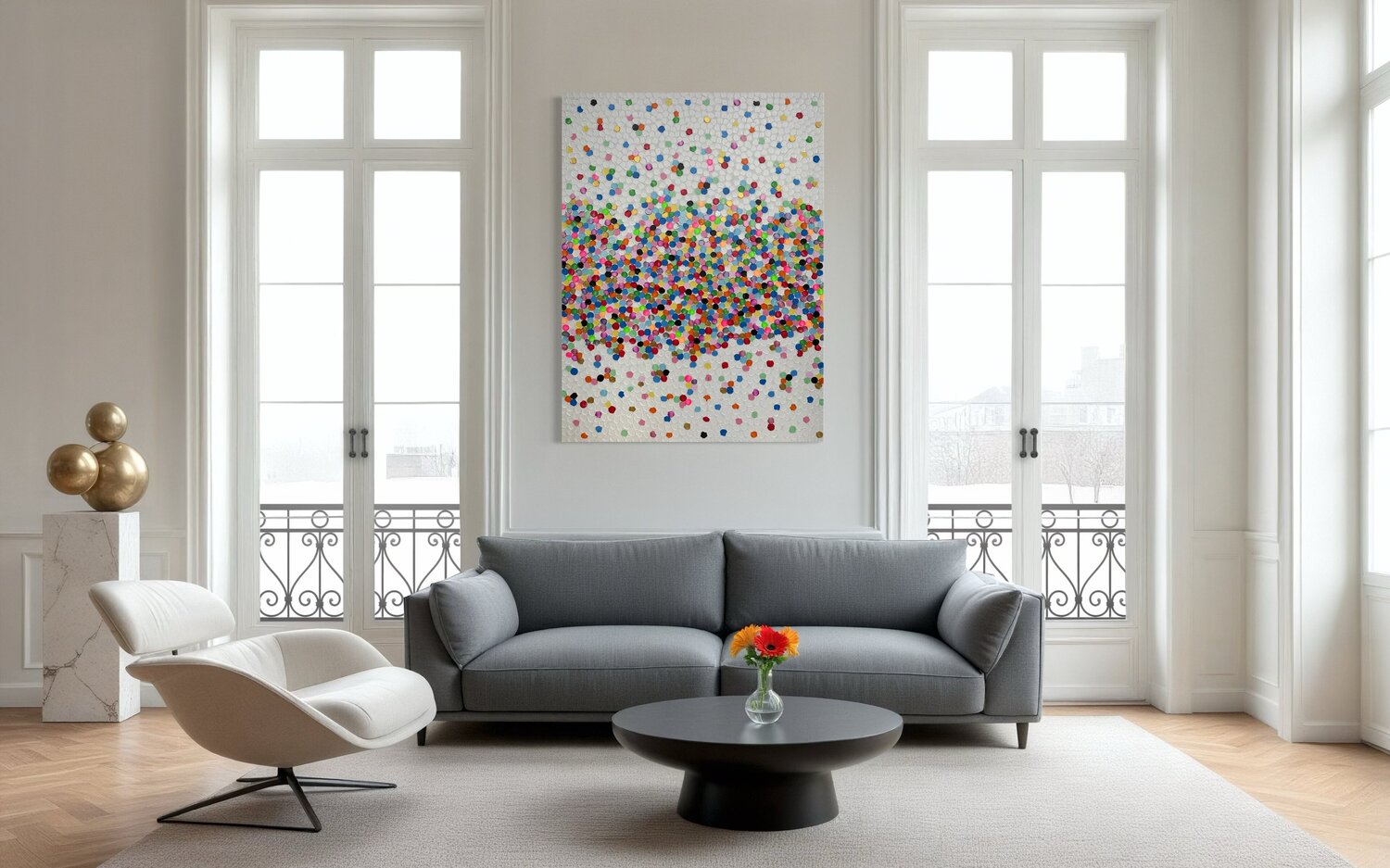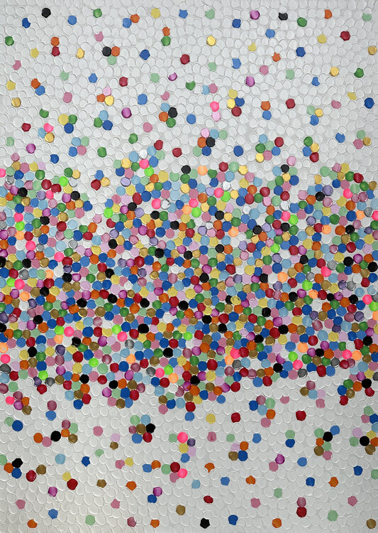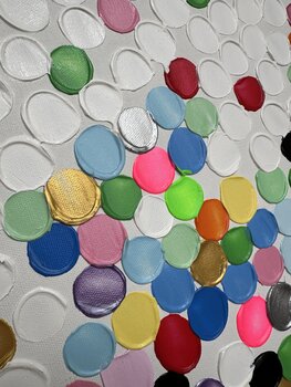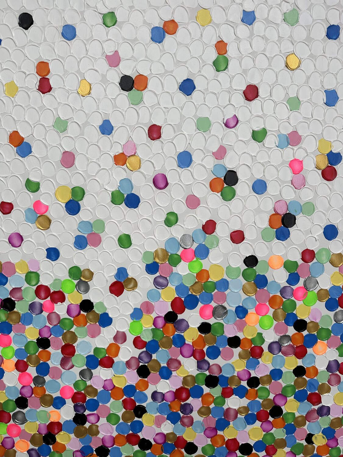 In quest'opera, realizzata con colori acrilici e gel strutturato, ho voluto catturare la gioia e la vivacità di una pioggia di coriandoli. Questa rappresentazione minimalista utilizza punti dai colori vivaci che si diffondono sulla tela come una delicata esplosione, trasmettendo all'osservatore un senso di festa e gioia. È una celebrazione visiva che riempie ogni stanza di energia positiva e un tocco di spensieratezza.