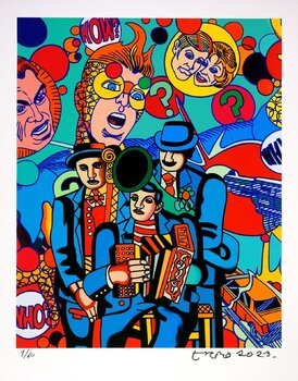 Erró è un pittore isolano nato nel 1932 particolarmente noto per i suoi dipinti pop art ispirati ai fumetti. Dopo gli studi artistici in Norvegia e in Italia, si stabilisce in Francia nel 1958 dove incontra le principali figure del movimento surrealista come André Breton. Nel frattempo ha cofondato il movimento artistico "Figuration Narrative" con artisti come Peter Klasen e Hervé Télémaque. La Figuration Narrative è un movimento che sostiene un ritorno alla figurazione in contrapposizione all’astrazione, molto popolare negli anni ’60. Il movimento è intimamente legato alla rivoluzione sociale e politica del maggio 1968. Se l'estetica è vicina a quella della Pop Art, gli artisti di Figuration Narrative si oppongono politicamente al movimento americano, che consideravano troppo egemonico, troppo formale e indifferente alle lotte politiche dell’epoca.