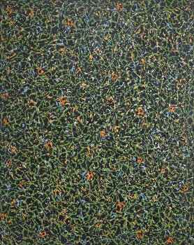 Ho lavorato con interesse sull'ordine in cui la natura crea se stessa e sul movimento costantemente ripetitivo della vita al suo interno. Le tracce del suolo della foresta, il terreno intricato di muschio e le creature microscopiche poco appariscenti si avvicinano a me come un flusso enorme. Sembrano immobili, ma in realtà si creano e si estinguono costantemente, influenzandosi a vicenda. In quest'opera, le linee, i punti e i motivi ripetitivi che… riempiono lo schermo registrano questo flusso di vita. Piuttosto che definire chiaramente la forma, ho cercato di lasciare il respiro e il ritmo della natura sullo schermo attraverso la ripetizione e l'accumulo di pennellate. Il colore incentrato sul verde si basa sull'immagine della vita e della crescita, e gli altri colori permeati nel mezzo sono tracce di energia e strati di tempo. Nell'azione ripetitiva, divento parte della natura e cerco di essere assimilato per un po' a quel respiro. Spero che questo schermo diventi uno spazio in cui lo spettatore possa soffermarsi per un po' e riprendere fiato.
