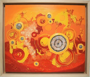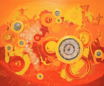 I motivi circolari al centro dell'opera suggeriscono il movimento dell'energia dal centro verso l'esterno, con cerchi interconnessi che evocano un organismo vivente… o particelle dell'universo. La tecnica dell'artista dà vita al concetto di energia attraverso una texture tridimensionale, la diffusione delle pennellate e la stratificazione dei colori.