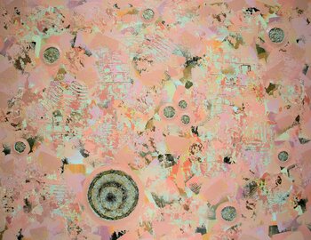 L'artista utilizza magistralmente una tonalità rosa, avvolgendo la tela… per rappresentare l'energia delicata e confortante della vita. Motivi circolari, posizionati strategicamente, simboleggiano sia il centro dell'esistenza che la natura ciclica dell'energia. La loro ripetizione e le diverse dimensioni alludono sottilmente al ritmo e allo scorrere del tempo. Gli accenti metallici creano un effetto scintillante, che ricorda le onde luminose, illustrando la costante creazione e dissipazione dell'energia.