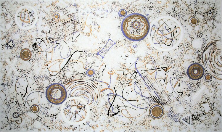 Nel realizzare questo pezzo, ho incanalato la mistica del cosmo e la vibrante danza delle particelle subatomiche. Attraverso una miscela armoniosa di surrealismo ed espressionismo, invito gli spettatori a un viaggio simbolico attraverso la tela. I motivi rappresentano il nucleo dell'esistenza stessa, oscillando tra ordine e caos. Ogni tratto del mio pennello risuona della vitalità della vita, infondendo nello spazio un'energia perpetua che agita… l'anima e risveglia l'immaginazione.