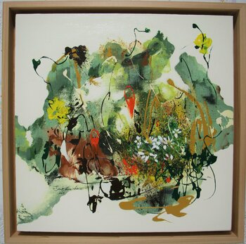 Realizzata con pennellate fluide e delicate sbavature di colore, l'opera d'arte presenta forme che evocano la crescita… delicata delle piante e il ritmo naturale del respiro. La tela prende vita con un'armoniosa miscela di tonalità naturali: verdi, marroni, gialli e arancioni si intrecciano e si diffondono, visualizzando la continua circolazione e lo scambio dell'energia ecologica della vita. Il dinamico gioco di texture dense e colori al centro dell'opera simboleggia la vitalità e il potere rigenerativo della natura, mentre lo spazio circostante suggerisce uno spazio illimitato per l'espansione di questa energia.
