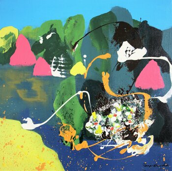 Notate come i blu e i verdi creino un senso di profondità, mentre i rosa e i gialli vibranti… agiscano come esplosioni di luce ed energia che si ritrovano nel mondo naturale. La tecnica dell'artista prevede gocciolamenti e schizzi di vernice, in particolare di bianco, giallo e nero, a simboleggiare la cruda esplosione di energia e il respiro stesso della natura.