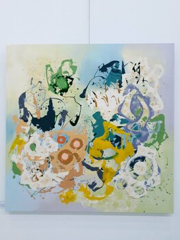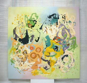 Colori organici come il verde, il giallo e il viola si distribuiscono con grazia sulla tela,… simboleggiando la crescita della natura e la diffusione dell'energia vitale. Le forme circolari e floreali, parzialmente visibili, alludono ai ricorrenti motivi creativi della natura e ai semi della vita. Pennellate dinamiche e tratti di pittura sparsi esprimono vividamente il movimento della natura e il flusso di energia, il tutto realizzato con acrilico su tela.