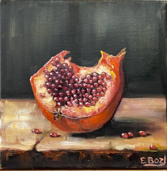 Ho riversato la mia passione in questo dipinto a olio, catturando la ricca e vibrante essenza dei semi di melograno, pieni di vita. Con realismo vintage, ho voluto evocare una sensazione senza tempo, evidenziando la bellezza grezza, quasi sacra, del frutto. Quest'opera emana un bagliore caldo ed energizzante, invitando gli spettatori ad apprezzare la profonda vitalità nascosta nei momenti quotidiani. È una celebrazione dei dettagli squisiti e della… forza duratura della natura.