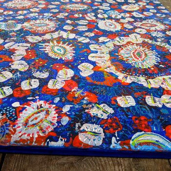 Le sue opere sfaccettate e vibranti sono create utilizzando acrilico, tempera, collage e inchiostro su tela, carta o materiali di recupero.