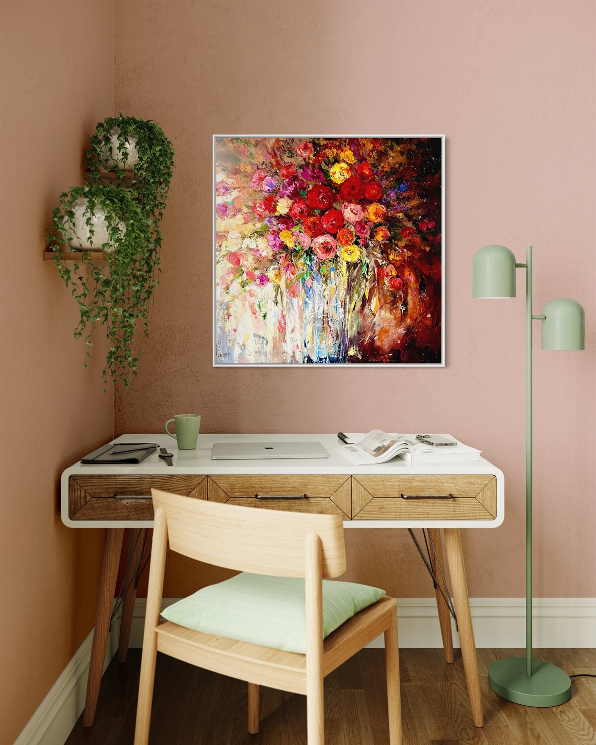 In quest'opera, ho riversato la mia passione in fiori vibranti e vorticosi, catturando la bellezza fugace dei momenti più luminosi della vita. Con pennellate spesse a olio, ho voluto trasmettere energia, calore e il gioioso caos della natura nella sua massima espressione. Questo dipinto infonderà a qualsiasi spazio uno spirito vivace e stimolante, invitandovi a sentire il pulsare di una vitalità in piena fioritura a casa vostra ogni giorno.