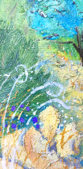 Le splendide montagne dell'Alta Provenza mi affascinano con la loro imponenza e i panorami che ci circondano. Il panorama cambia a seconda delle frequenti variazioni meteorologiche. Ho catturato gli attimi in cui splendeva il sole e le nuvole non coprivano le cime delle montagne. I sentieri rocciosi, battuti dagli escursionisti coraggiosi, sono percorribili solo a piedi. Per mettere in risalto la diversità del paesaggio e il verde circostante mescolato… al blu, ho utilizzato molte texture diverse.