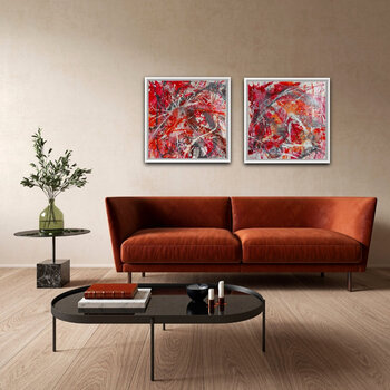 Le opere sono state concepite come dittici che possono essere presentati anche singolarmente. Il dipinto è in rosso, arancione, bianco e grigio. Questa tavolozza di colori limitata aumenta i contrasti e crea molta profondità nell'immagine. È un'esplosione delle emozioni che provo quando dipingo, che è quasi come una storia d'amore, da qui simbolicamente il colore rosso. La composizione è molto dinamica, i colori corrono in tutte le direzioni. Il… mio modello qui è stato il famoso pittore Jackson Pollock. L'opera è incorniciata in una cornice bianca con gap d'ombra.